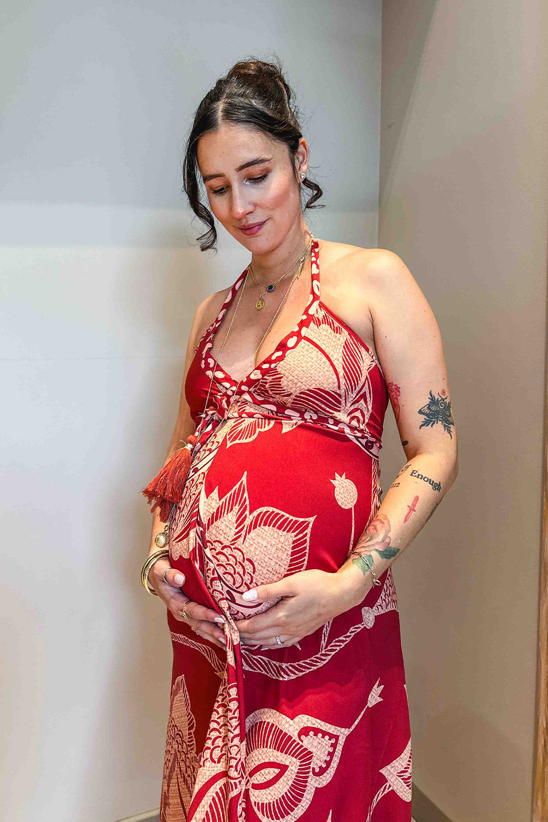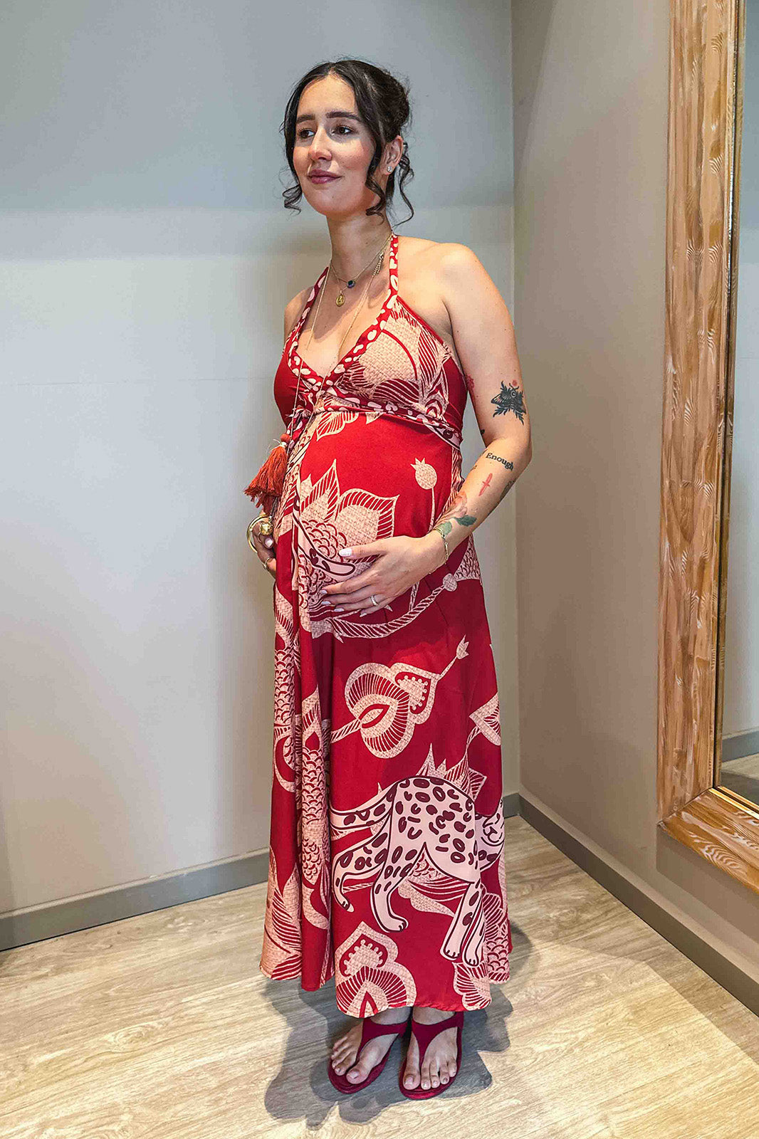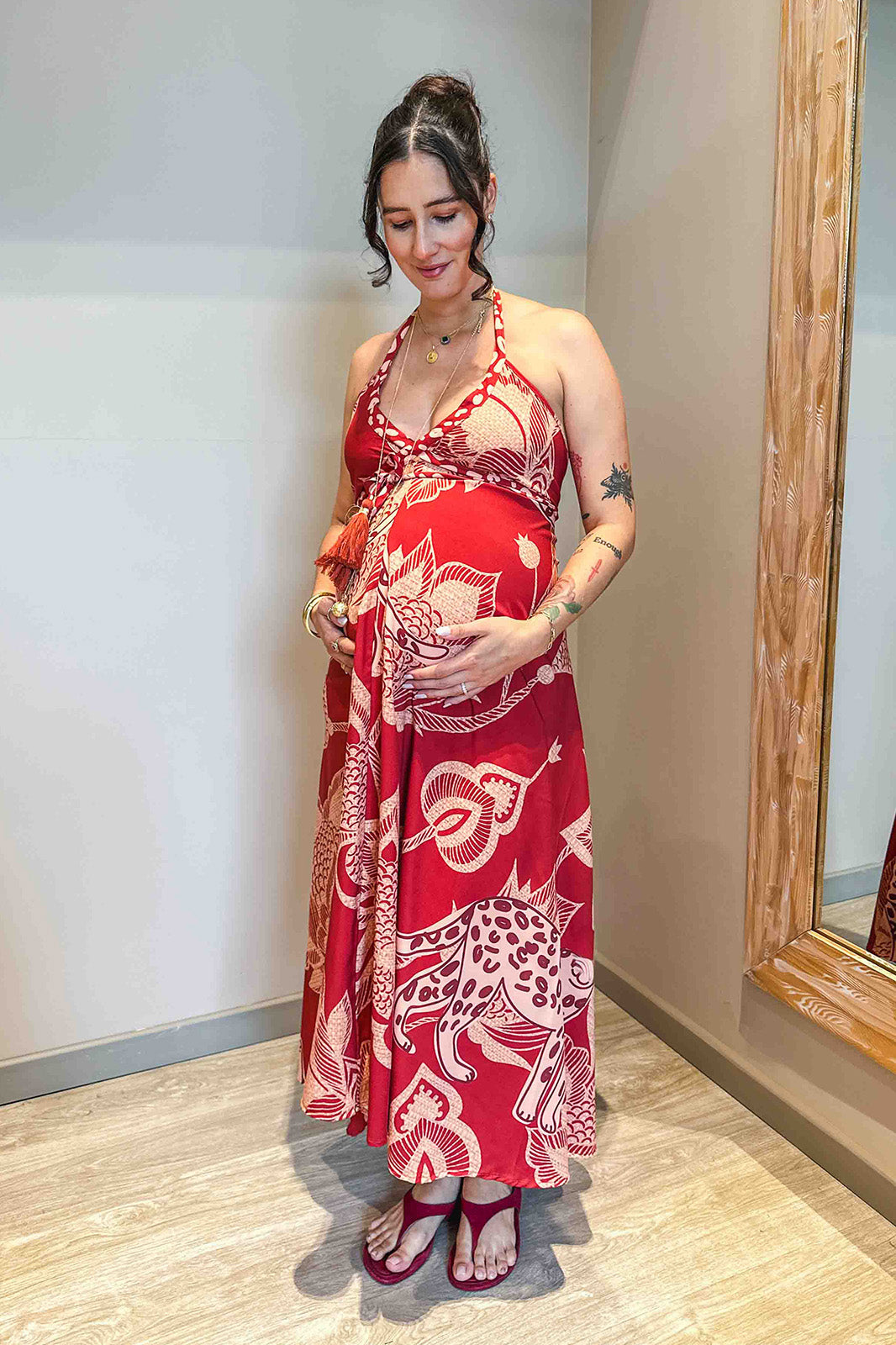 Vestido largo de amarrar en el cuello y tiras que cruzan en el busto. 90% poliéster 10% elastano