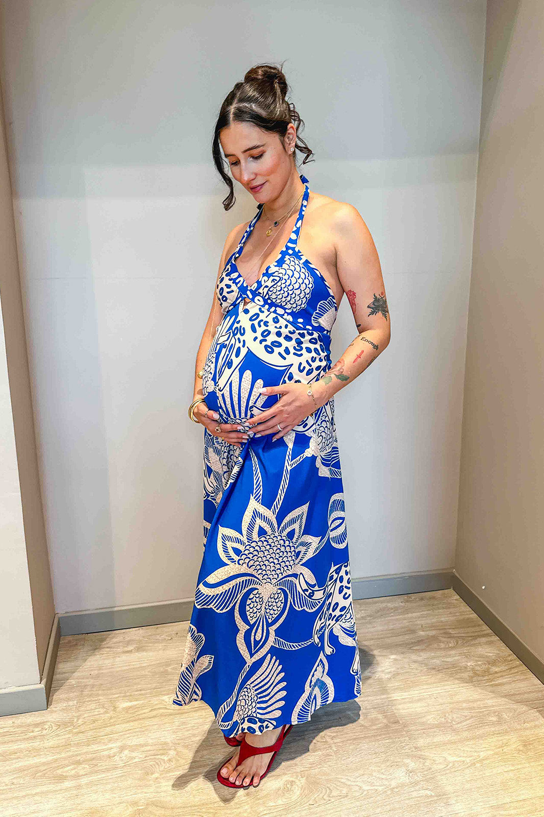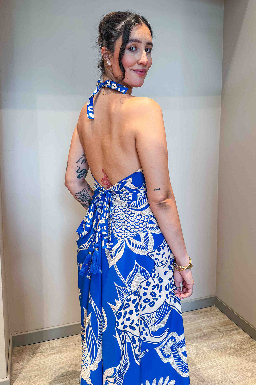 Vestido largo de amarrar en el cuello y tiras que cruzan en el busto. 90% poliéster 10% elastano